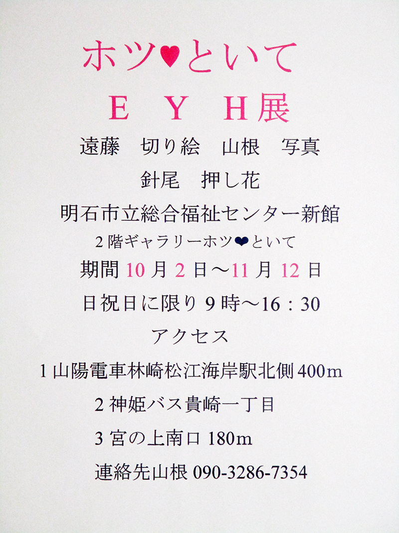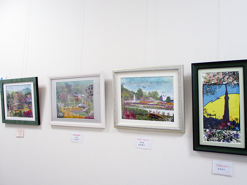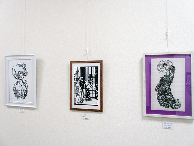 遠藤氏の切り絵、山根氏の写真、針尾氏の押し花それぞれの個性豊かな素晴らしい作品の数々、ぜひご覧ください